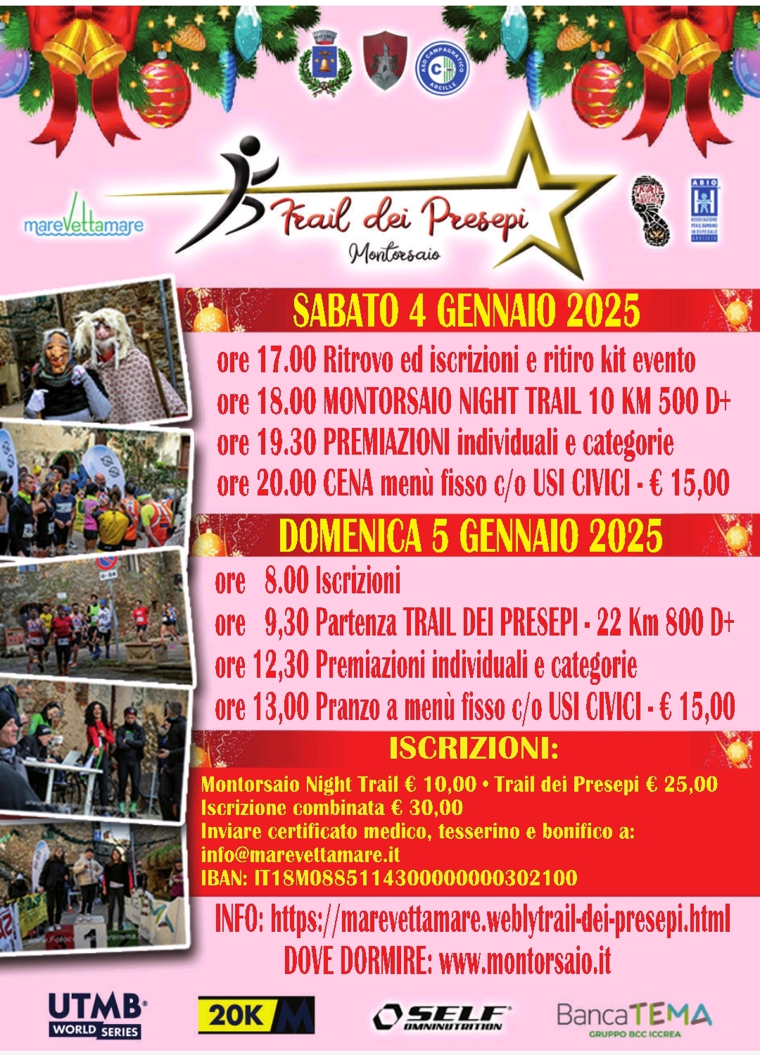 La giornata principale sarà quella del 5 gennaio, interamente dedicata alle competizioni trail. I percorsi, progettati con cura, attraversano le bellezze naturali e i panorami mozzafiato del territorio, offrendo una sfida entusiasmante per gli atleti. I partecipanti avranno l’opportunità di correre tra sentieri pittoreschi, immersi in un contesto unico, con il borgo e i presepi a fare da cornice suggestiva.