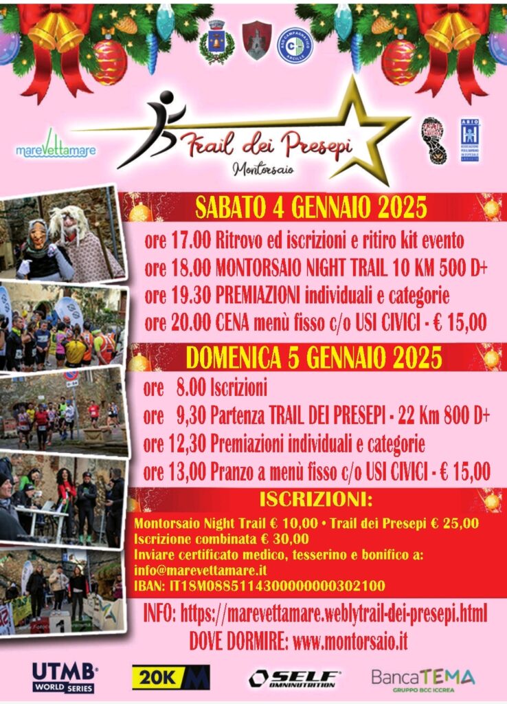 Il Trail dei Presepi 2025 è un evento che coinvolge sportivi, famiglie e appassionati di tradizioni. È un’occasione unica per scoprire Montorsaio, vivere il Natale in modo originale e condividere momenti di autentica convivialità.