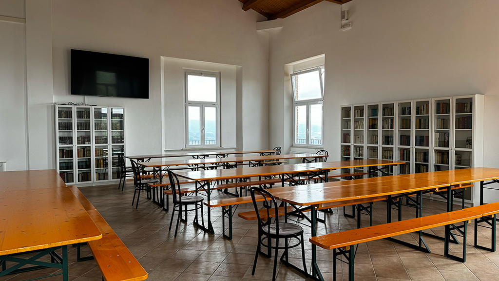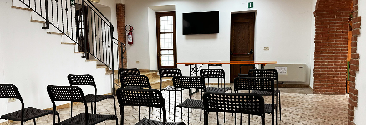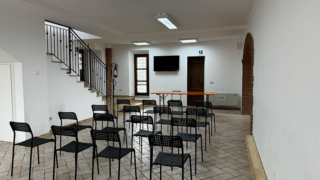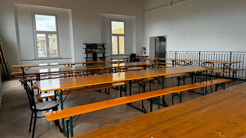 L’ingresso alle stanze del piano superiore è situato in via del Moro. Al livello strada si trova un disimpegno con locali tecnici, seguito da una breve rampa di scale che conduce a una grande sala e ai bagni. Al piano superiore sono presenti una cucina professionale e una sala capace di ospitare circa 150/200 persone, riducibili a 80/100 con l’uso di tavoli. Questi spazi, oltre ad essere utilizzati dagli Usi Civici e dallo Spazio Vivo come ristorante durante sagre o altre celebrazioni, possono essere affittati, con o senza uso cucina, per eventi privati. Inoltre, sono ideali per convegni e conferenze, grazie all’ampia capienza e alla dotazione di altoparlanti e di un grande TV smart utilizzabile come schermo per presentazioni. Per informazioni sull’affitto degli spazi, è possibile rivolgersi agli uffici dell’A.S.B.U.C.